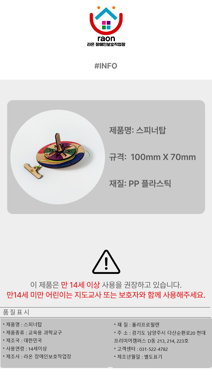대표 : 박정민   |    상호명 : 라온 장애인보호작업장  |  대표번호 : 031-522-4782    |    fax : 031-522-4783   |  통신판매신고업 번호 : 2023-다산-1031